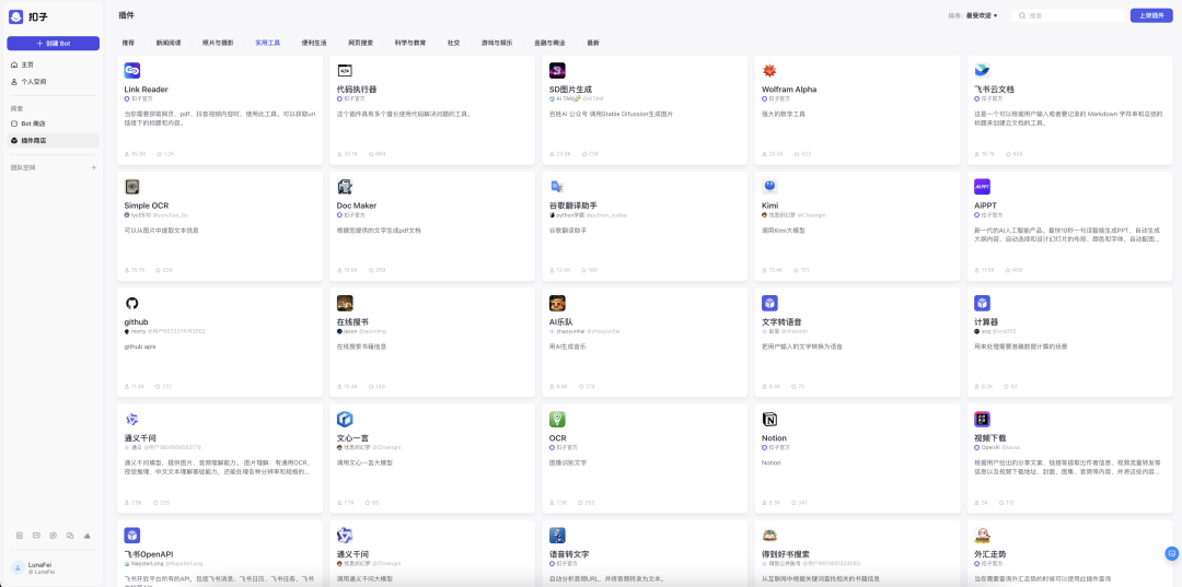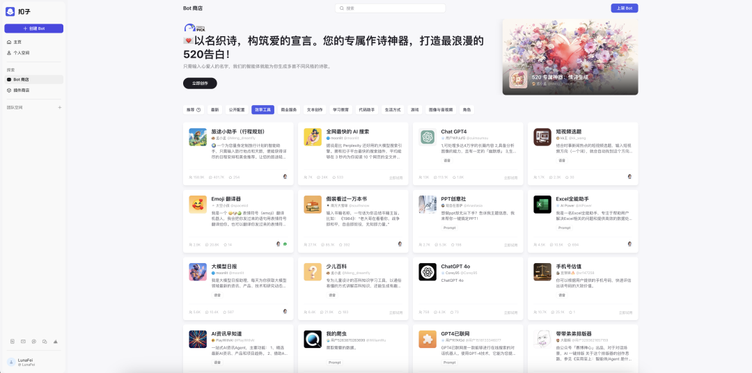 在商店内,扣子的真实用户创建并发布的智能体和插件数量更多,用户间使用收藏量更多,覆盖的场景更丰富、分类更科学。