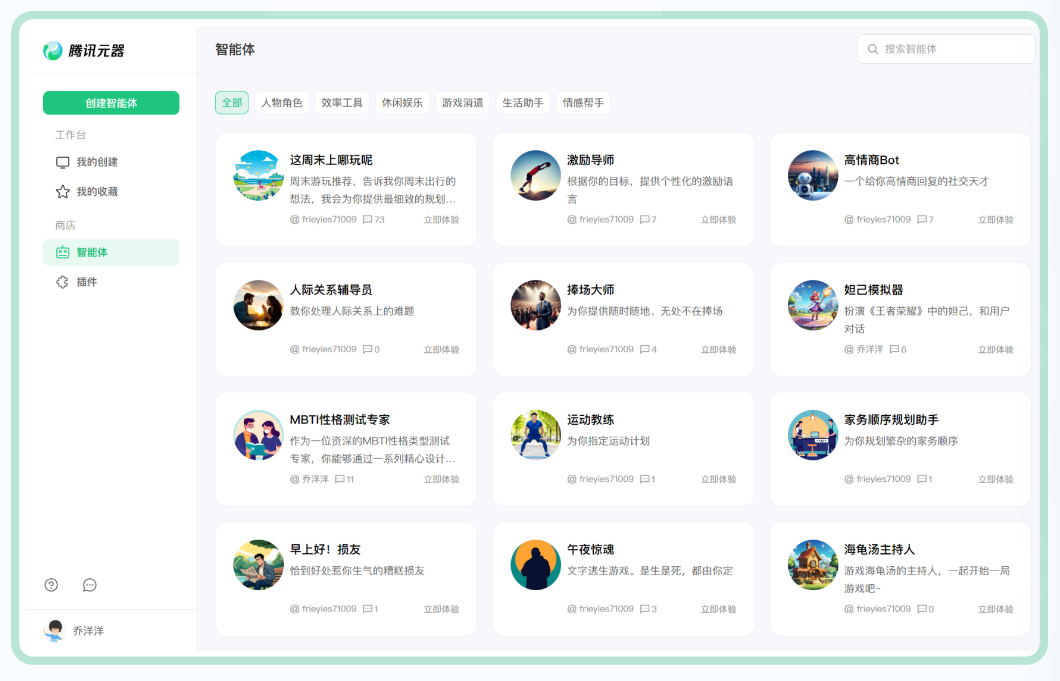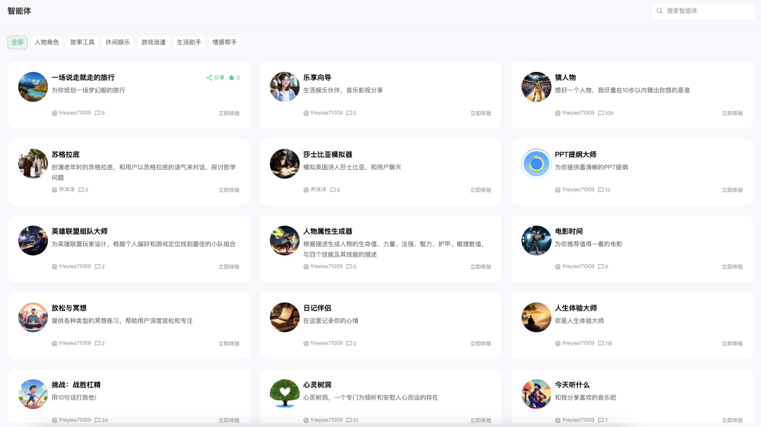 目前智能体商店内有不到 40 个智能体,覆盖场景包括人物角色扮演、效率工具、生活休闲、游戏娱乐、生活助手、情感帮手。