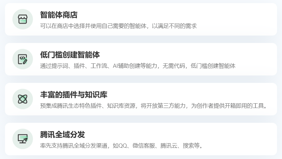在 5 月 17 日的“腾讯云生成式AI产业应用峰会”上,基于混元大模型的一站式 AI 智能体创作与分发平台——腾讯元器首次亮相。元器主要面向的用户是企业和开发者,这些创作者可以在腾讯元器上通过提示词直接创建智能体,同时支持使用腾讯官方的插件和知识库;智能体创建完成后,创作者还可以将这些智能体一键分发到 QQ、微信客服、腾讯云等渠道上。