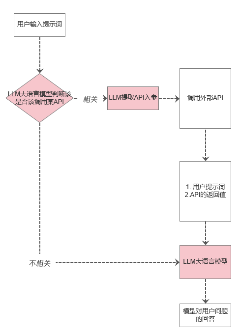 大模型在收到用户问题后,会通过 function call 对用户的问题进行意图判定,决定是否需要调用插件下的某个 API;如果需要,就会调用插件进行回答,可以查看具体插件、API 返回的信息;大模型会将 API 返回的结构化 json 字符串进行自然语言润色后,回复给用户。