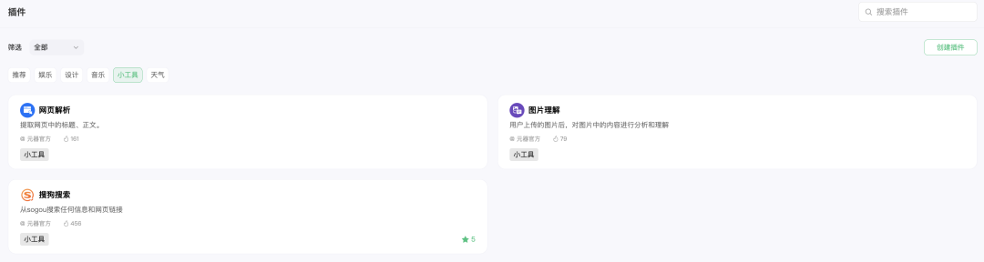 目前插件商店内有不到 15 个插件,覆盖场景包括娱乐、图像设计、音乐、工具、天气。