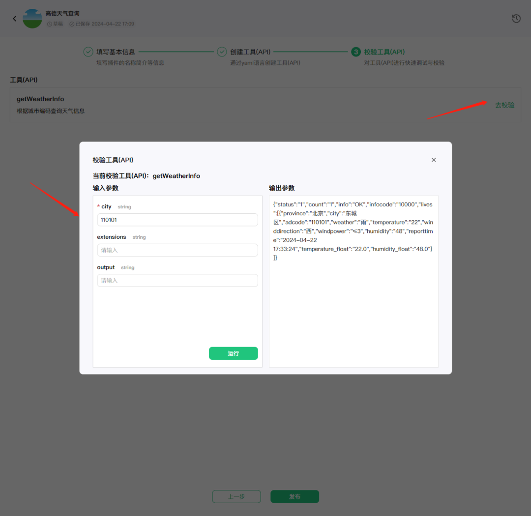 ●校验工具(API):点击右侧的「去校验」按钮,打开校验弹窗,输入 API 调用需要的参数,输入后点击「运行」;如果API成功返回调用信息,则说明调用成功。