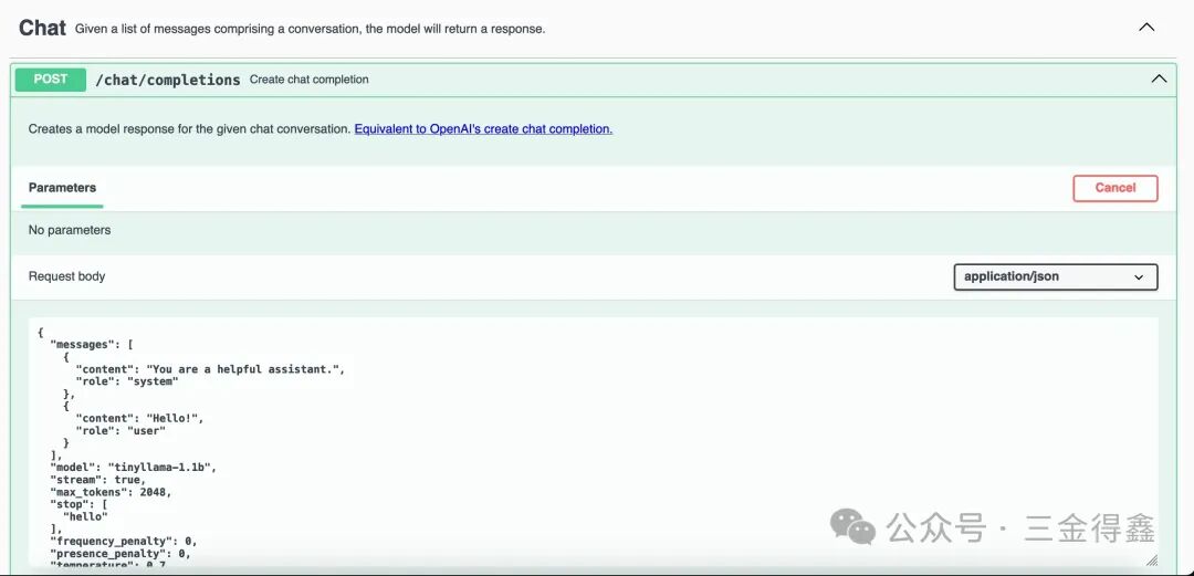 API Reference 打开之后会列出可用的 API 接口,我们以/chat/completion为例进行调用: