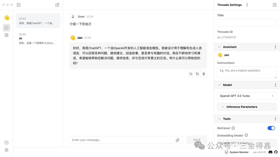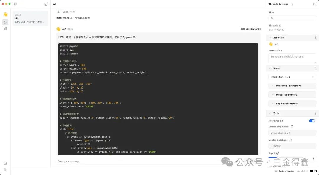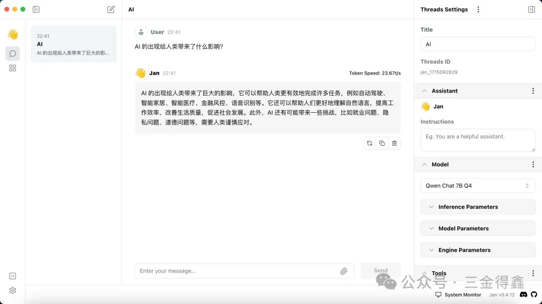 是什么?Jan 是一个开源的、可作为 ChatGPT 替代品的客户端产品,在 Github 上已经斩获18k 的 star,它支持: 部署本地大模型:直接在个人电脑上运行 Llama 或 Mistral 等 AI 模型以完成私有化部署。无需互联网连接 - 将所有数据和处理保存在本地。 调用远程 API:支持连接到远程 API,例如 OpenAI、Groq 或 Mistral API。无需高级硬件即可访问 AI 功能,所有处理均在云端处理。 100% 离线使用:哪怕没网,也能流畅使用,一切数据都只保留在个人电脑上。 跨平台:支持 Apple Intel、Linux Debian 和 Windows x64 以及 Apple M 系列。 扩展:属于高级玩儿法,可以自定义 Jan 来满足特定需求。