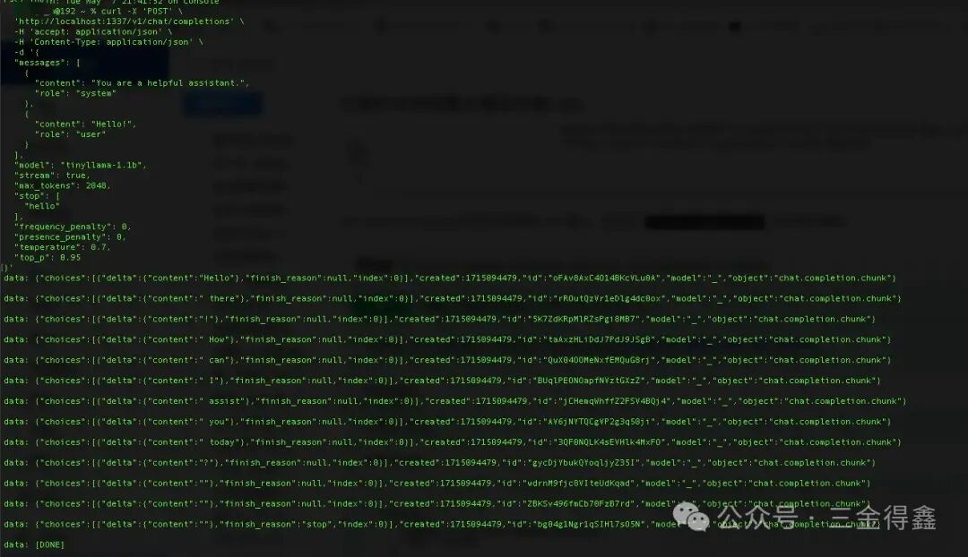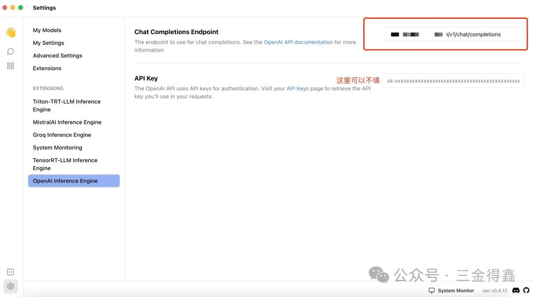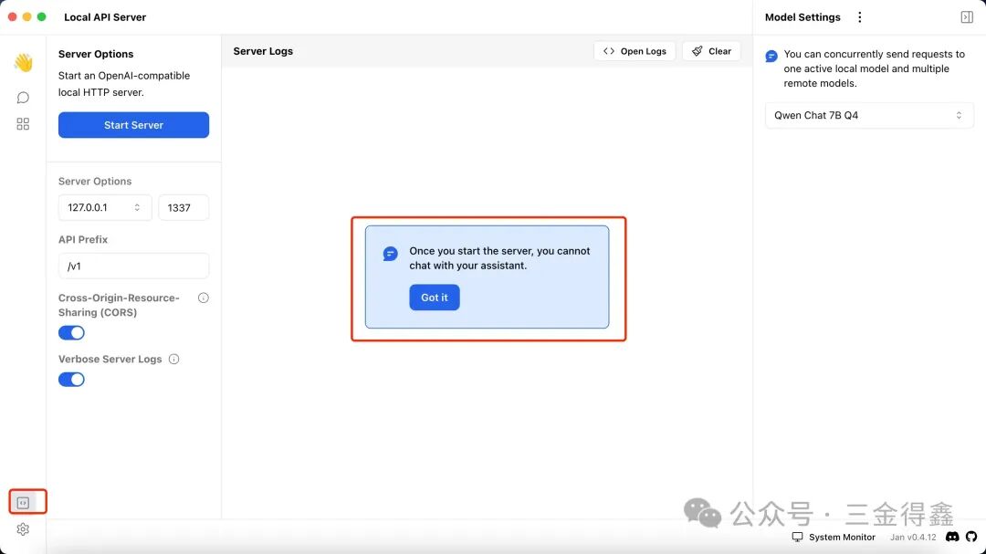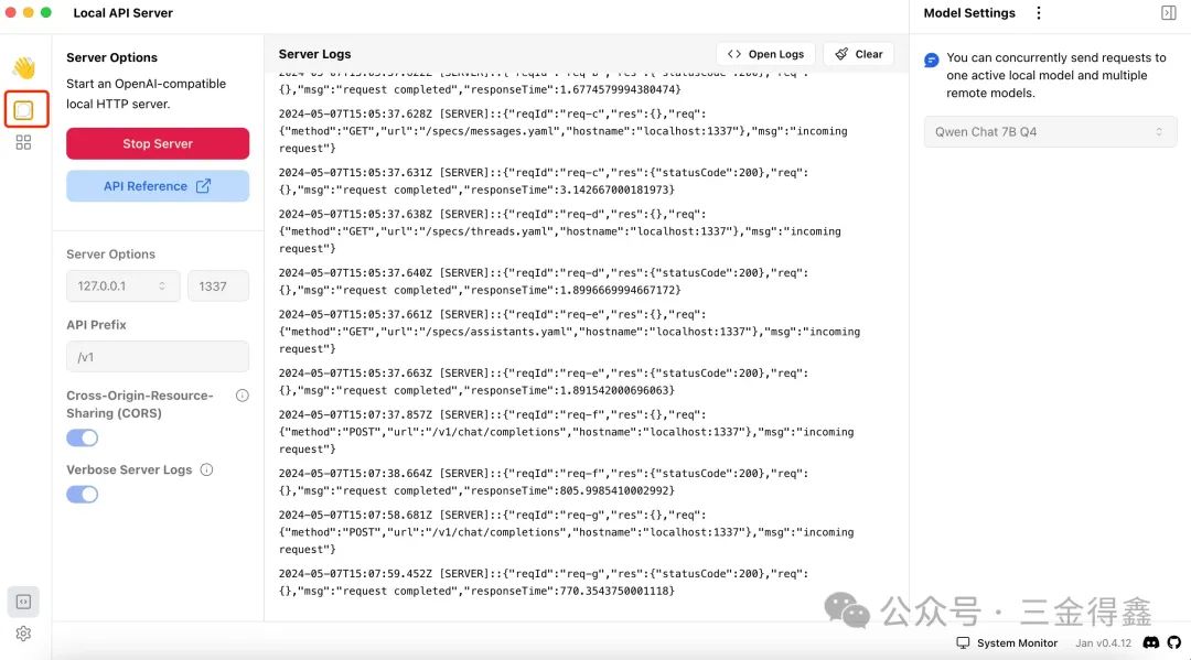 如上图,一旦启动服务器,我们就无法在 Jan 中进行聊天了,只能通过调用这个服务的方式。