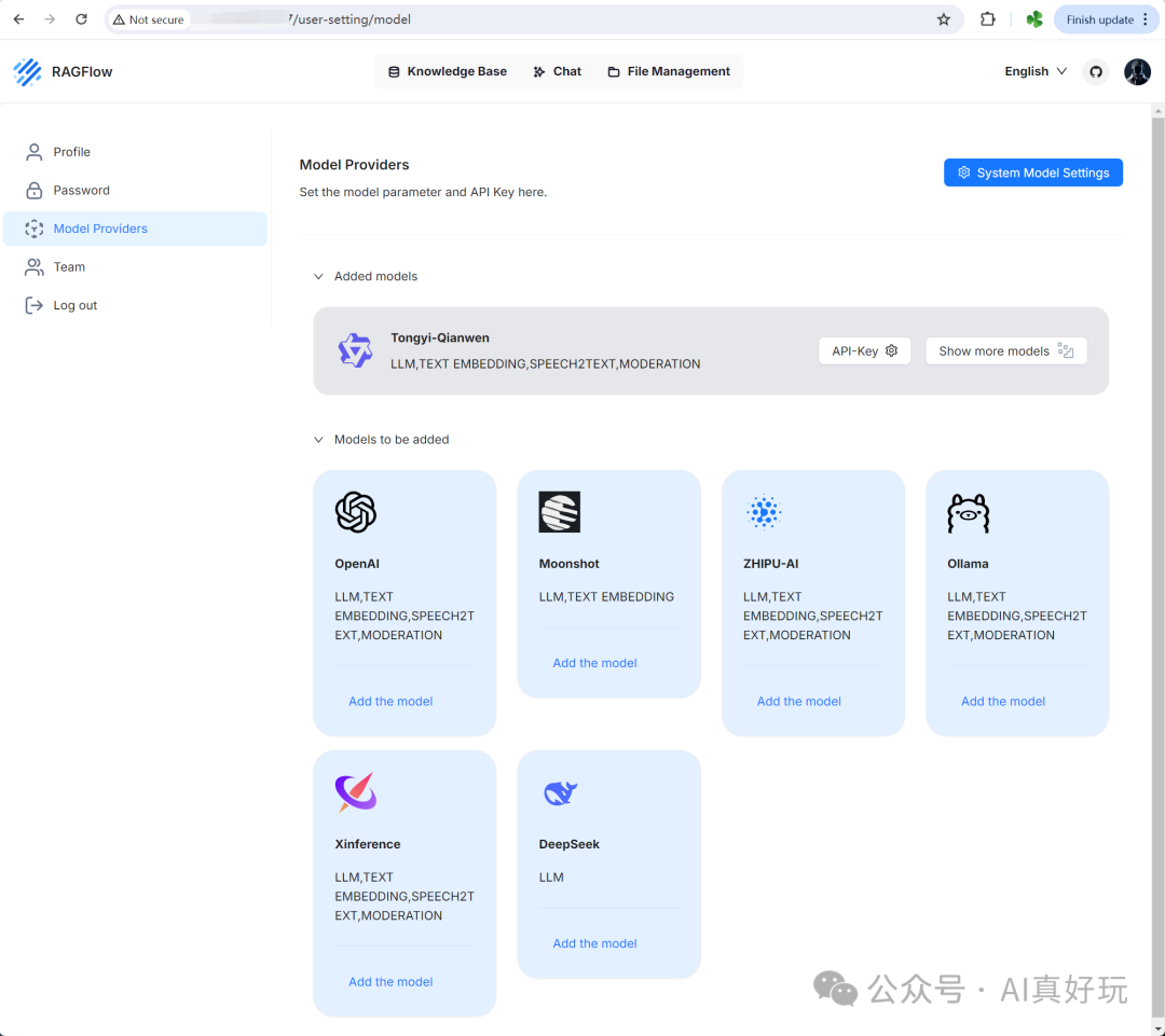 每个 RAGFlow 账户都可以免费使用通义千问的 text-embedding-v2 模型。这就是为什么你能在已添加模型列表中看到 Tongyi-Qianwen。以后您可能需要更新您的 Tongyi-Qianwen API 密钥。