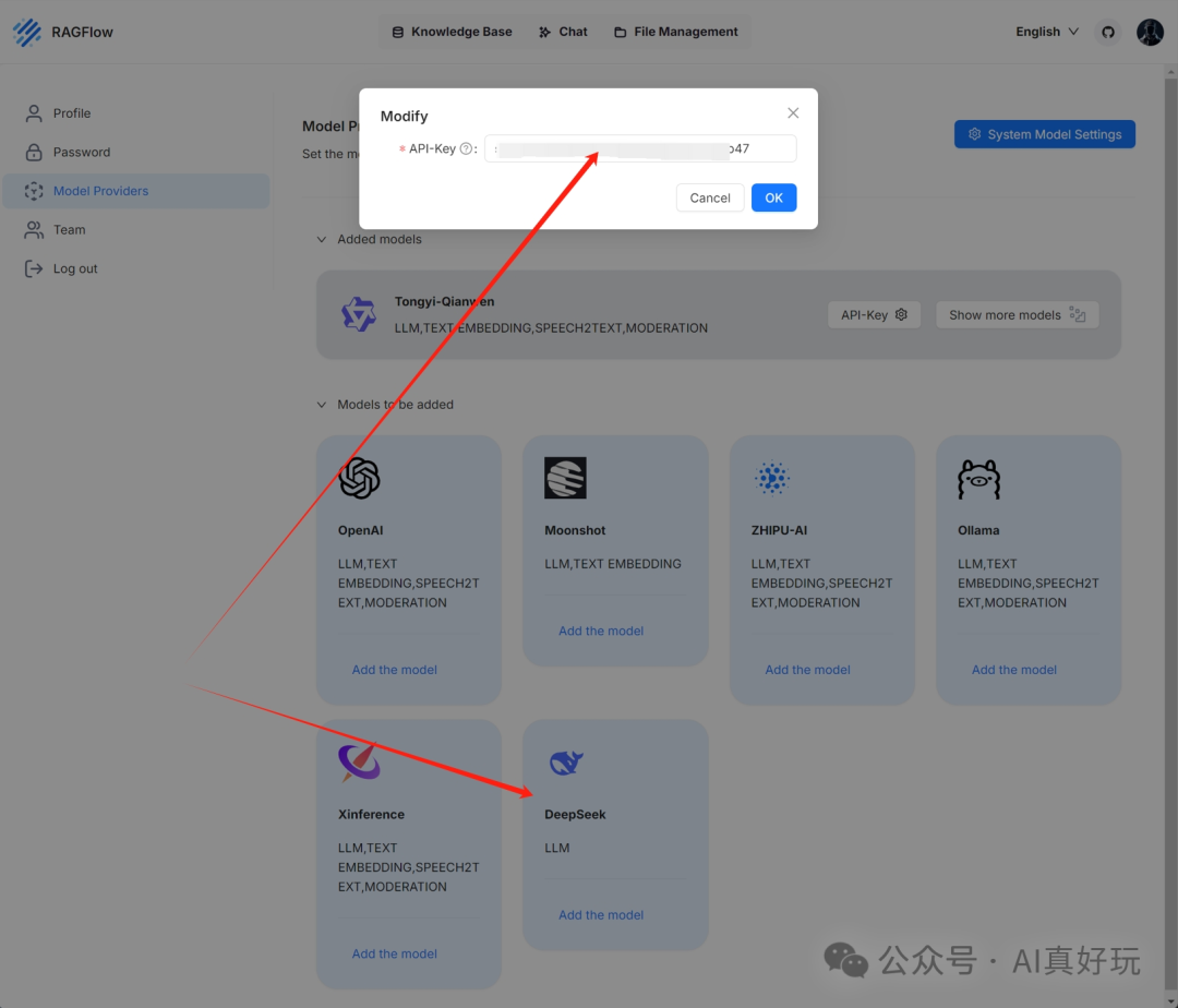 注意:RAGFlow 还支持使用 Ollama 或 Xinference 在本地部署 LLM。