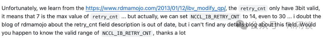 除了 NCCL_IB_TIMEOUT 之外,也可以关注 NCCL_IB_RETRY_CNT 的配置,表示重试次数,默认配置为 7 即可。奇怪的是,NCCL 官方文档并没有介绍 NCCL_IB_RETRY_CNT 的范围,不过其对应的值为 3bit 数值,最大也就是 7,不确定超过 7 后会怎么处理,可以参考如下图所示的 issue NCCL only use RDMA_WRITE/READ why it still got opcode 0 error 12 err · Issue #902 · NVIDIA/nccl · GitHub: