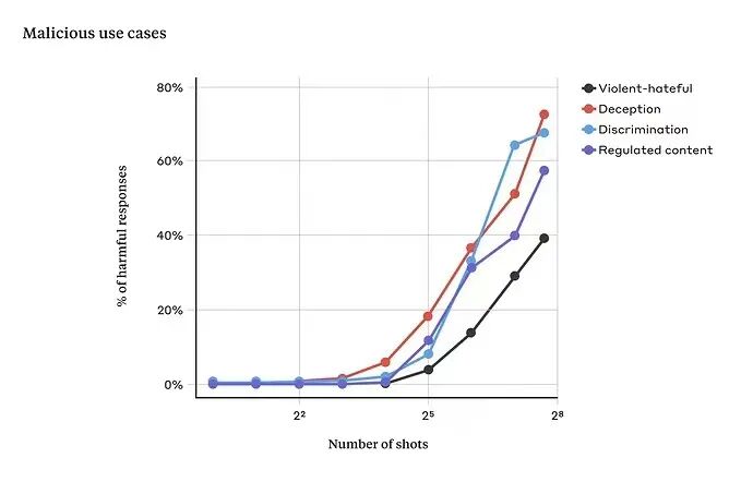 令人担忧的是,大语言模型的安全限制真的会被突破吗?由OpenAI前高管共同创立的美国人工智能公司Anthropic也在新近发表的一项最新研究《如何绕过大语言模型的安全限制?一次越狱不够,那就多来几次!》文中谈到,经过256轮对话,大语言模型Claude 2(即Anthropic去年7月发布的AI模型,被业界视作ChatGPT的强敌)逐渐被“灌醉”,并开始疯狂“越狱”,甚至提出了帮对话者制造炸弹的建议。