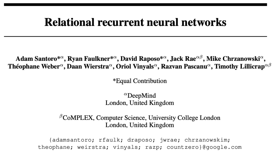 DeepMind和伦敦大学学院的这篇论文提出关系推理模块RMC,能够在序列信息中执行关系推理,在WikiText-103, Project Gutenberg 和 GigaWord 数据集上达到了当前最佳性能。