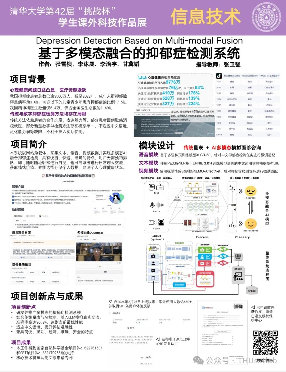 语音与音频技术实验室(THUsatlab)的本科实习生张雪桢、李沐晟、李治宇、甘冀韬组队以“基于多模态融合的抑郁症检测系统”的项目参与清华大学第42届挑战杯,最终成功入围信息赛道的学校终审答辩,并斩获了校二等奖。