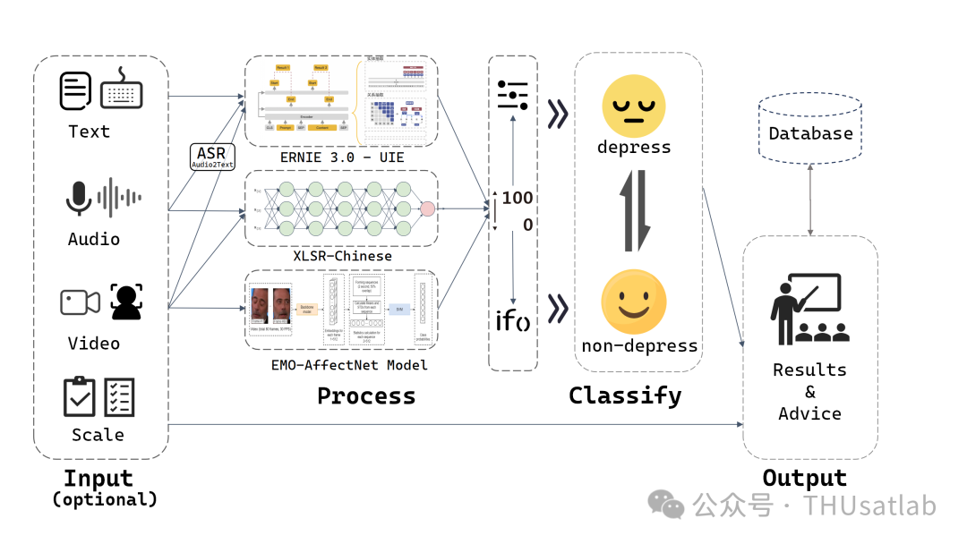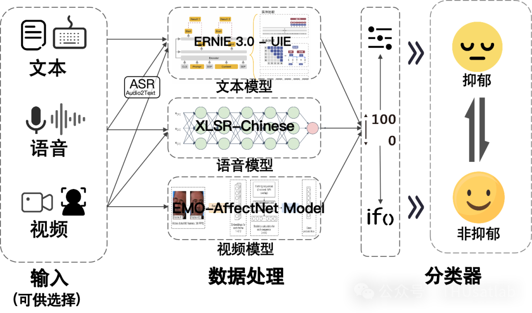在数据处理部分,模型在三个独立的基座模型基础上,针对抑郁症检测任务和中文环境进行了微调适配,具体来说,语音模块基于多语种预训练模型XLSR-53,在中文数据集上微调;文本模块使用了PaddleNLP基于ERNIE 3.0预训练模型训练的中文通用信息抽取模型UIE;视频模块 基于视觉情感识别框架EMO-AffectNet,提取了其中的部分情感成分进行融合判断。