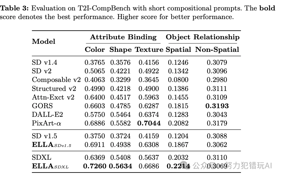 • ELLA在T2I-CompBench上的表现也优于其他SOTA模型,例如DALL-E 3和SDXL,特别是在包含多种属性和关系的多物体组合场景中。