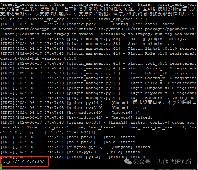 显现网址和80端口说明启动成功。 这时就可以在公众号的后台与你的AI小助手对话了。