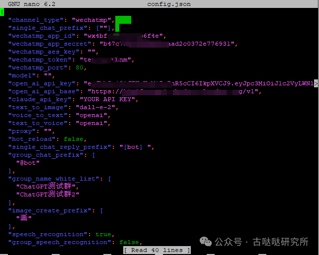 打开配置文件,添加以下信息: {"channel_type":"wechatmp","single_chat_prefix":[""],"wechatmp_app_id":"wx73f9******d1e48","wechatmp_app_secret":"weca******est","wechatmp_aes_key":"","wechatmp_token":"tok**est","wechatmp_port":80,}