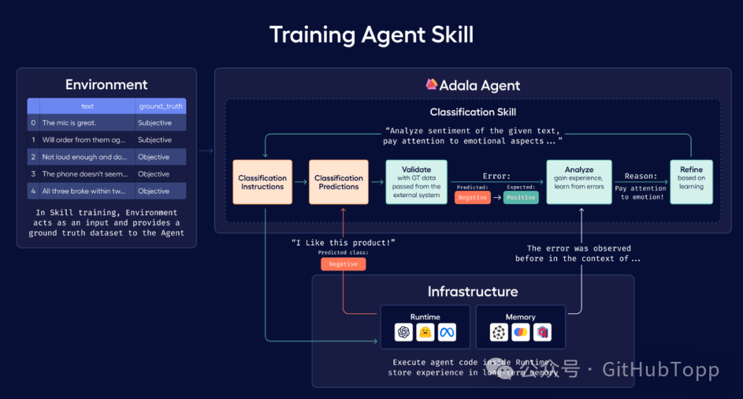 通过人工智能的Agent去标注数据! adala 为专门从事数据处理的代理提供了一个强大的框架,重点是各种数据标记任务。这些智能体是自主的,这意味着它们可以通过迭代学习独立获得一项或多项技能。这个学习过程受到他们的操作环境、观察和反思的影响。用户通过提供地面实况数据集来定义环境。每个代理都会在我们所说的“运行时”(LLM 的同义词)中学习并应用其技能。