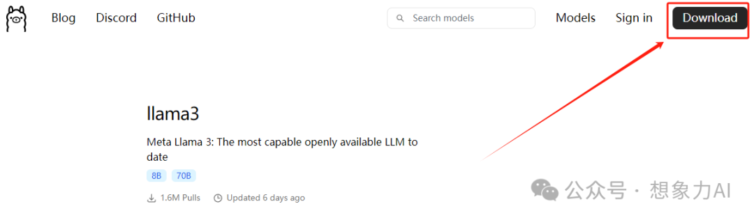 01 就像西方不能没有耶路撒冷一样,我们也不能没有开源的 AI 模型。只要这个开源的小模型是免费的、够好用、够小,它就是个好模型。 没错,就是 Llama3,相信大家都很熟悉了,羊驼家族的明星。https://ollama.com/library/llama3 首先我们需要进入Llama3的官方网站,下载一个软件,可以简单理解为启动器,看见这个可爱的羊驼,点击右上角的下载即可: