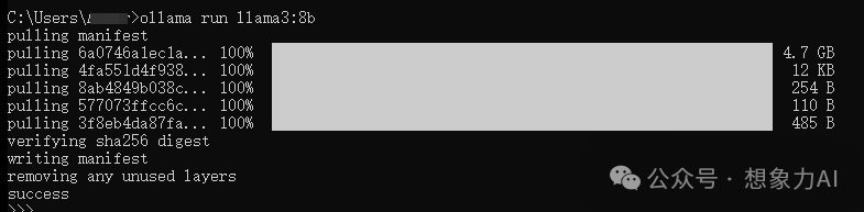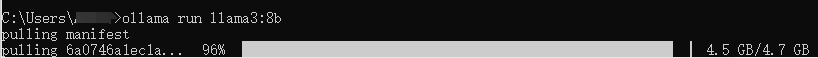 ok,此时一切正常,接下来我们准备安装 Llama3 8B 版本了,现在非常的方便,也只需要输入一行指令,即可自动安装。 我们可以在官网查看指令,选中 8B,右边的内容复制一下,再回到刚刚的界面粘贴回车就可以了,当然,我们后续如果想安装 70B 的版本,也只需要左边选中 70B 即可。