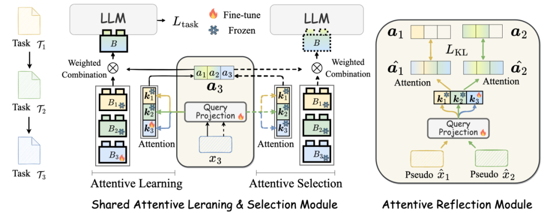 本文提出了针对大语言模型的共享注意力持续学习框架 SAPT,为同时应对灾难性遗忘和知识迁移的挑战提供了有效的解决方案。SAPT 的整体架构由两个关键组件组成,如图 2 所示:共享注意力学习与选择模块(SALS)和注意力反思模块(ARM)。在 SALS 中,注意力学习(实线)和注意力选择(虚线)通过共享注意力操作对齐。然后在 ARM 中,我们通过生成的伪样本帮助 SALS 回忆来自以前任务输入对应的正确的注意力权重。