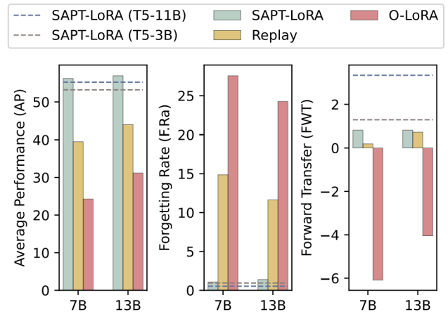 我们也将基础大模型拓展到了不同的架构。图 5 展示了基于不同大小的 T5 和 LLaMA-2 在 SuperNI 基准上的 SAPT 和基线方法的结果。可以观察到,SAPT 依旧能够有效地缓解灾难性遗忘并促进不同模型架构间的知识迁移。此外,平均性能随着模型基础能力的增强而提高(LLaMA-2 > T5),这进一步证明了我们提出的 SAPT 的通用性。