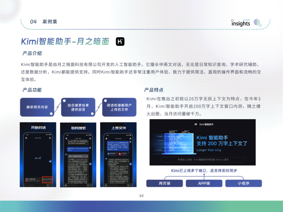 Kimi智能助手:月之暗面科技的创新实践 Kimi智能助手是由月之暗面科技有限公司开发的人工智能助手,它不仅支持中英文对话,还能提供日常知识查询、学术研究辅助和数据分析等多样化服务。Kimi的一个显著特点是其上下文理解能力,能够处理长达20万字的无损上下文,这一能力在近期的内测中扩展到了200万字,大幅提升了用户体验和交互效率。Kimi智能助手的成功展示了AIGC技术在提升交互质量和用户体验方面的潜力。