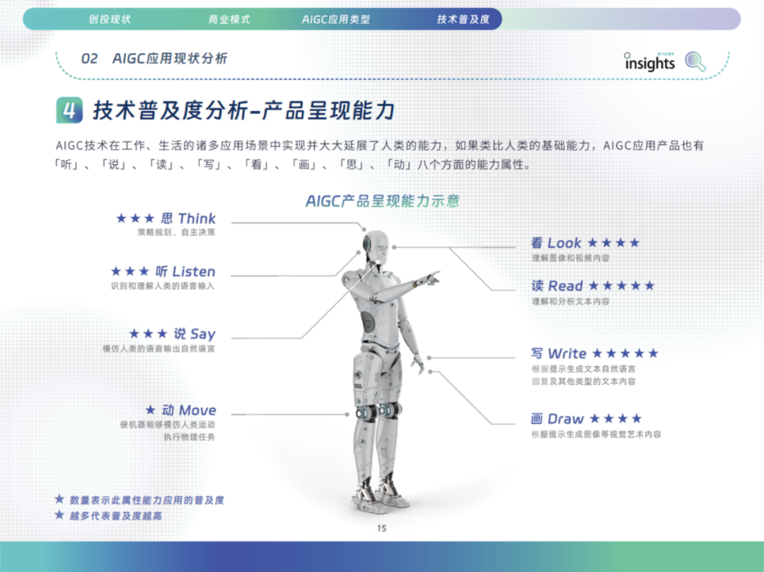 AIGC产品的能力可以从多个维度进行分析,包括其“听”、“说”、“读”、“写”、“看”、“画”、“思”和“动”等能力属性。