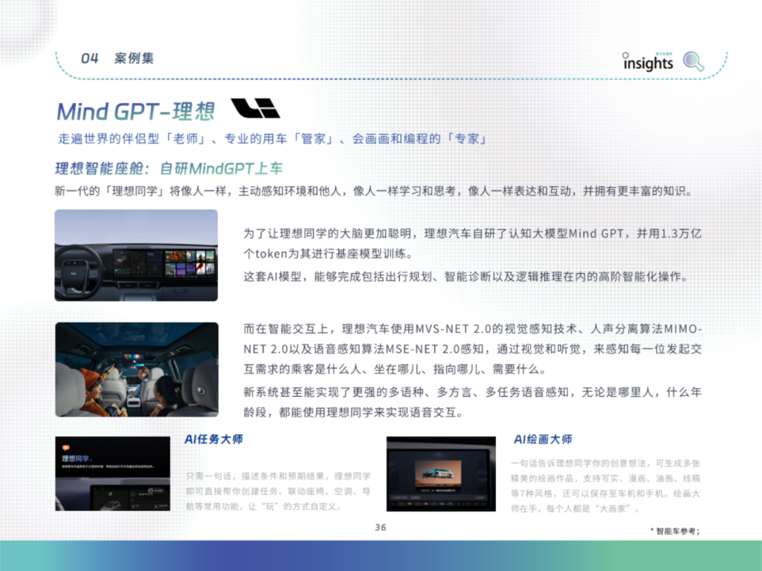 MindGPT:理想汽车的智能座舱技术 MindGPT 是理想汽车自研的认知大模型,它被应用于理想汽车的智能座舱中,使得汽车能够主动感知环境和乘客的需求。MindGPT能够执行包括出行规划、智能诊断和逻辑推理在内的复杂任务,并通过先进的视觉和语音感知技术与乘客进行交互。