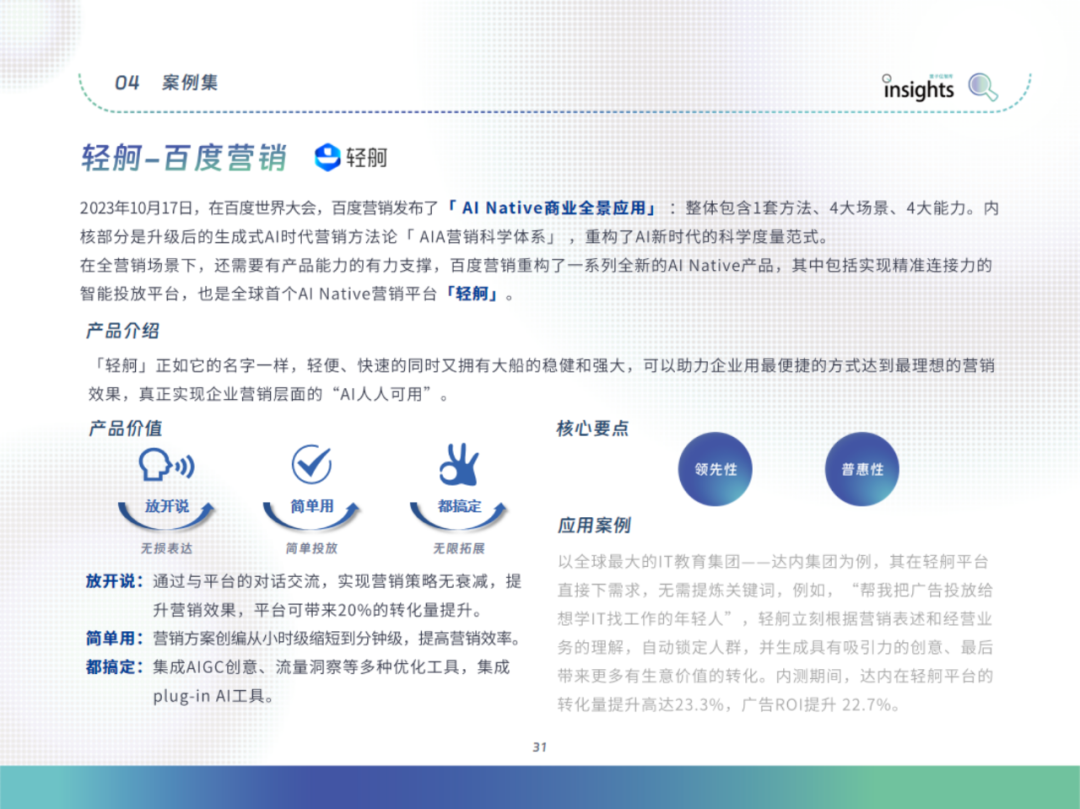 百度营销「轻」:AI营销的新范式 百度营销「轻」平台是百度推出的AI营销产品,它基于生成式AI技术,提供了一整套营销解决方案。这个平台通过智能投放和创意生成,帮助企业实现精准营销,提升转化率。特别是其「放开说」功能,允许用户以自然语言描述营销需求,平台会自动生成相应的广告创意和投放策略,极大地简化了营销流程并提高了效率。