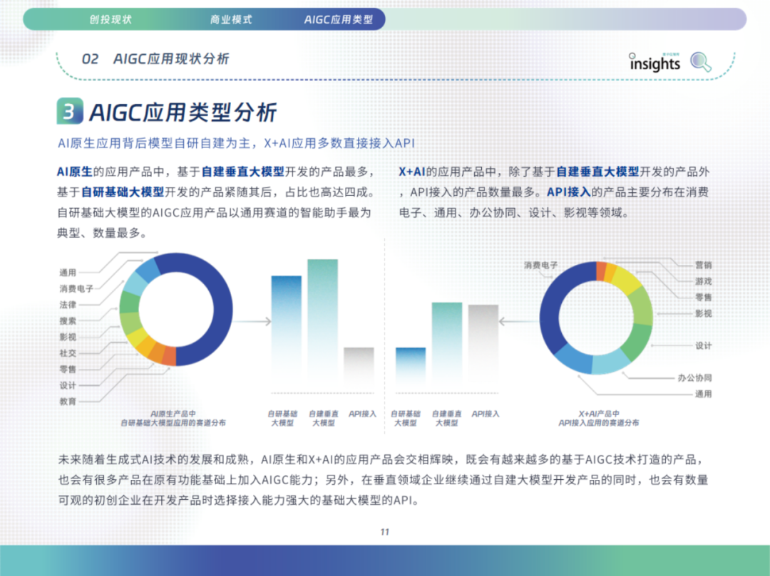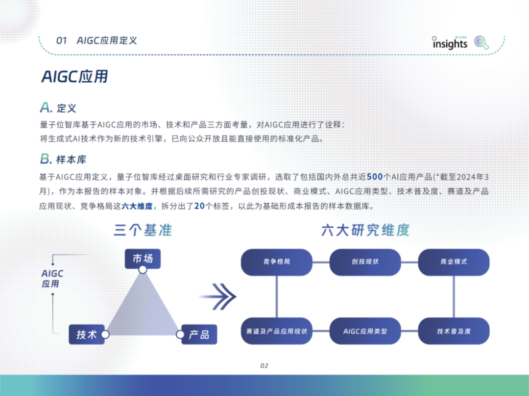 AIGC应用的定义与分类 AIGC应用,指的是利用人工智能技术自动生成或辅助生成内容的一系列产品和服务。量子位智库基于市场、技术和产品三个维度,对AIGC应用进行了全面的定义和分类。AI原生应用与X+AI应用的区分,以及大模型应用类型的分类,为我们理解AIGC的多样性和复杂性提供了清晰的框架。当前,中国AIGC应用正处于高速发展期,创投现状显示资金正快速向头部企业聚集,B端与C端的商业模式呈现出不同的特点和挑战。AI原生与X+AI应用的对比分析,揭示了不同技术路径下的产品发展状况。技术普及度的多维度分析,进一步展现了AIGC应用在不同模态和场景中的应用潜力。
