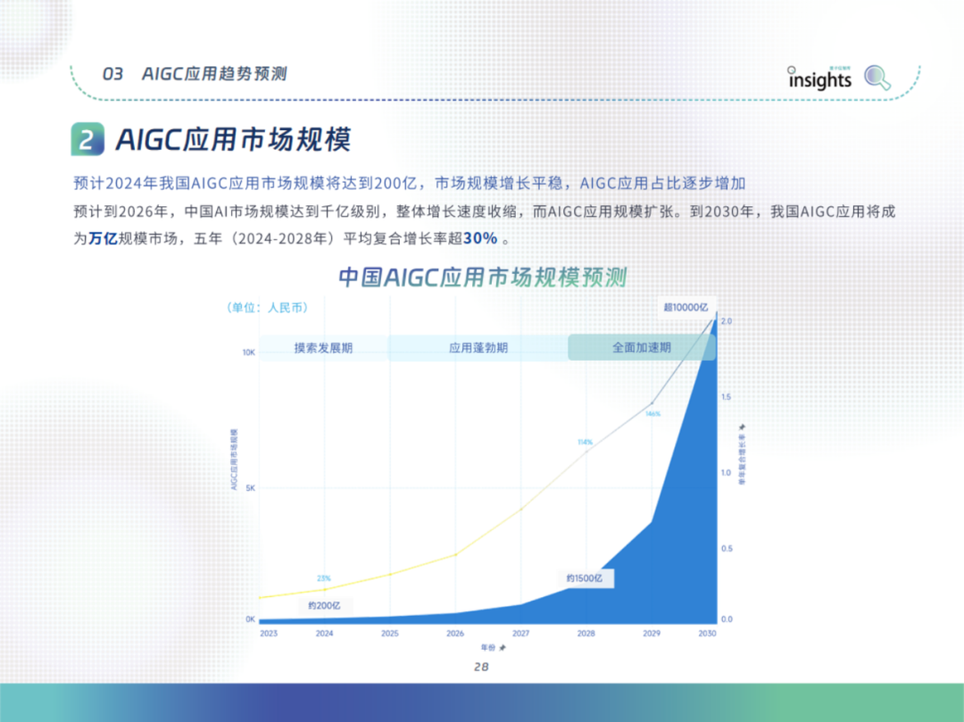 在这一阶段,AIGC应用将进入规模化盈利的时期。市场领导者将通过持续的技术创新和市场扩张巩固其地位,而中小企业则需要找到自己的细分市场或通过差异化竞争获得市场份额。这一时期,AIGC应用将成为多个行业标准工作流程的一部分。 市场规模预测与增长趋势 根据量子位智库的预测,中国AIGC应用市场规模将在2024年达到200亿人民币,并预计在2026年达到千亿级别。这一增长趋势反映了AIGC技术在各个行业中的广泛应用和深入渗透。 从2024年到2028年,预计AIGC应用将以超过30%的年复合增长率增长,到2030年市场规模将达到万亿级别。这一增长将由技术创新、市场需求的增加、以及政策支持等多方面因素驱动。