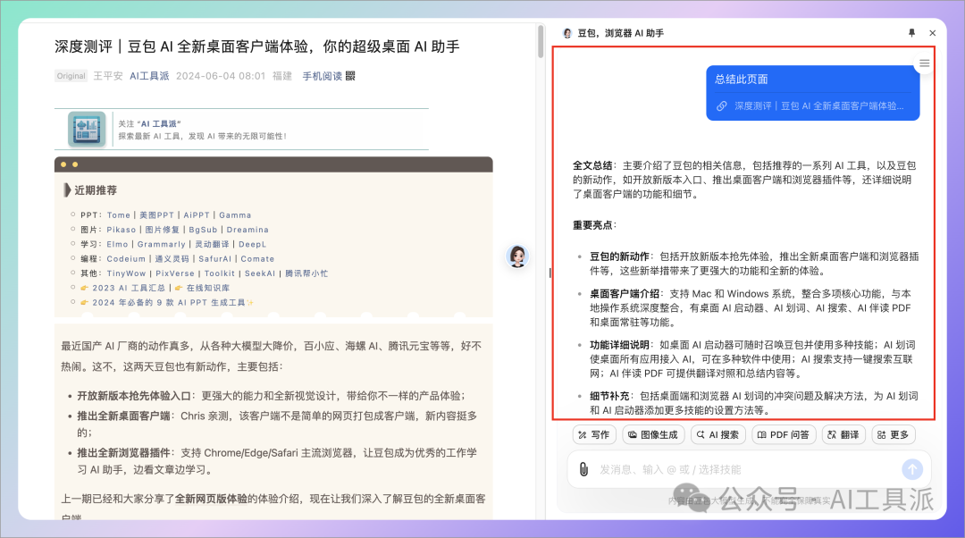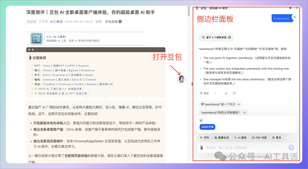 点击豆包的浮窗菜单按钮即可打开侧边栏面板,自动根据当前页面进行对话,其实本质上也是豆包对话页面。