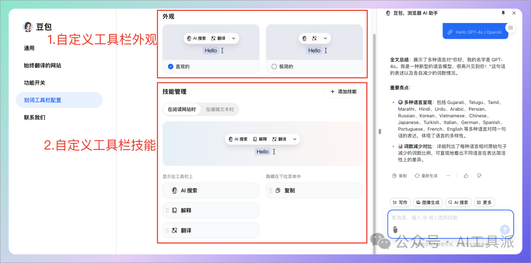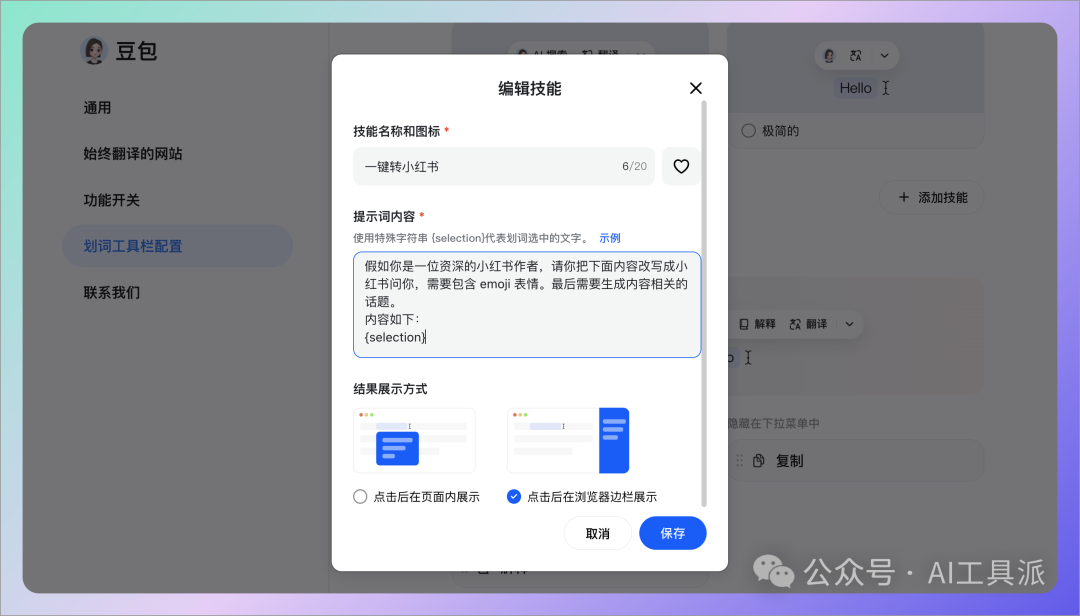 豆包浏览器插件不仅集成了AI 搜索、解释、翻译和复制等实用快捷工具,还允许用户对划词工具栏的外观进行个性化定制,甚至可以自定义工具栏技能。