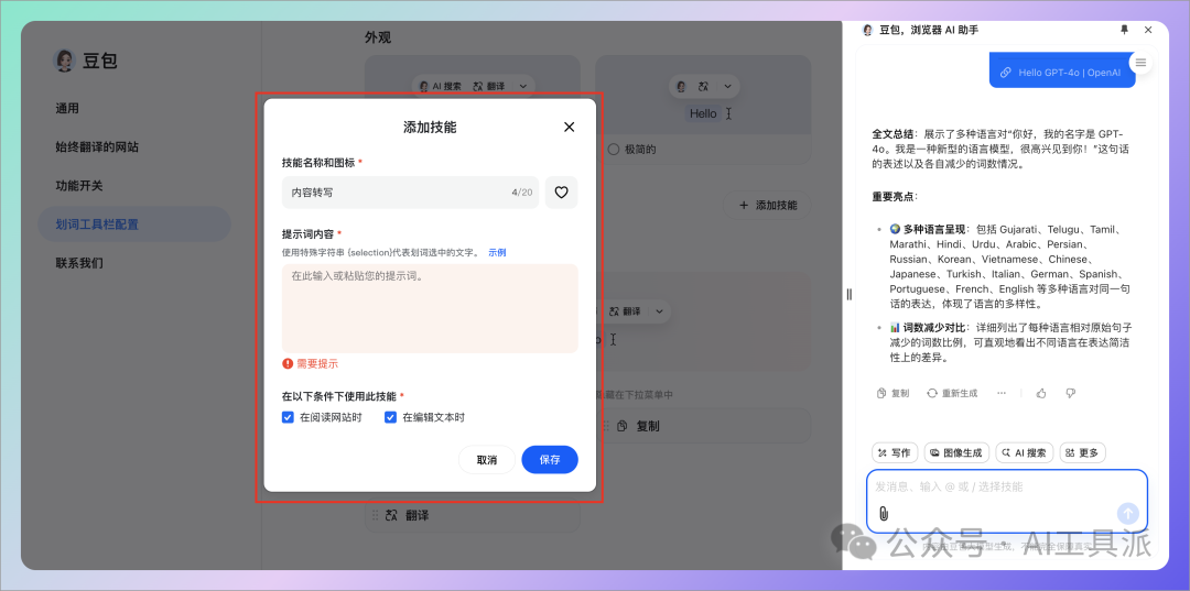 此外,用户还可以添加新的技能,本质上每个技能都是一个小的 Bot,包括技能名称、提示词内容和使用条件,在提示词内容中,还贴心支持变量 selection 表示当前划词的文字内容,让我们可以更加灵活的定制技能: