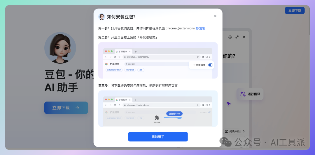 豆包提供了简单直接的下载和安装方式,无需通过 Chrome 插件商店即可下载。