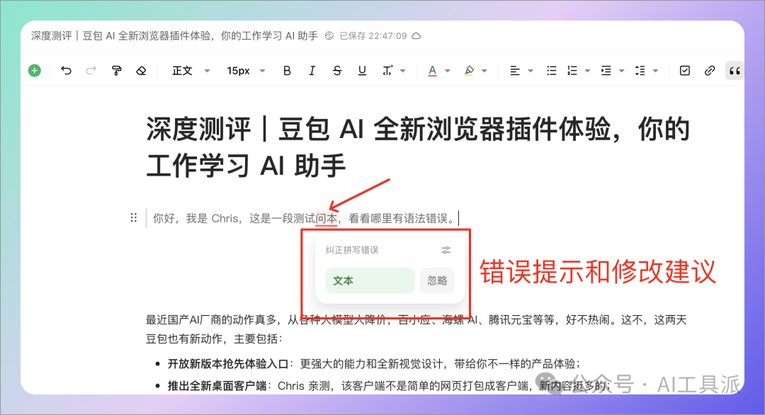 豆包浏览器插件还提供了智能语法检查,当我们在网页输入文本出现语法错误时,豆包会及时提醒,并提供修改建议,非常有用: