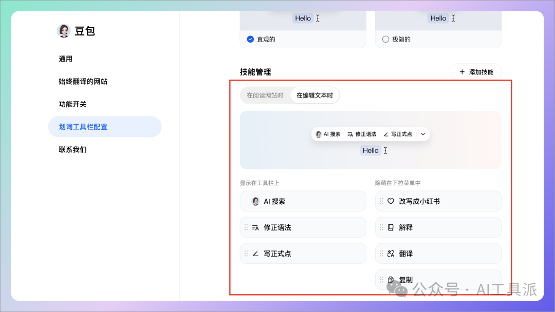 豆包有个有趣功能,就是可以分别为“阅读网站时”和“编辑文本时”指定不同的技能列表,比如编辑文本时,不需要使用“AI 总结”、“翻译”技能: