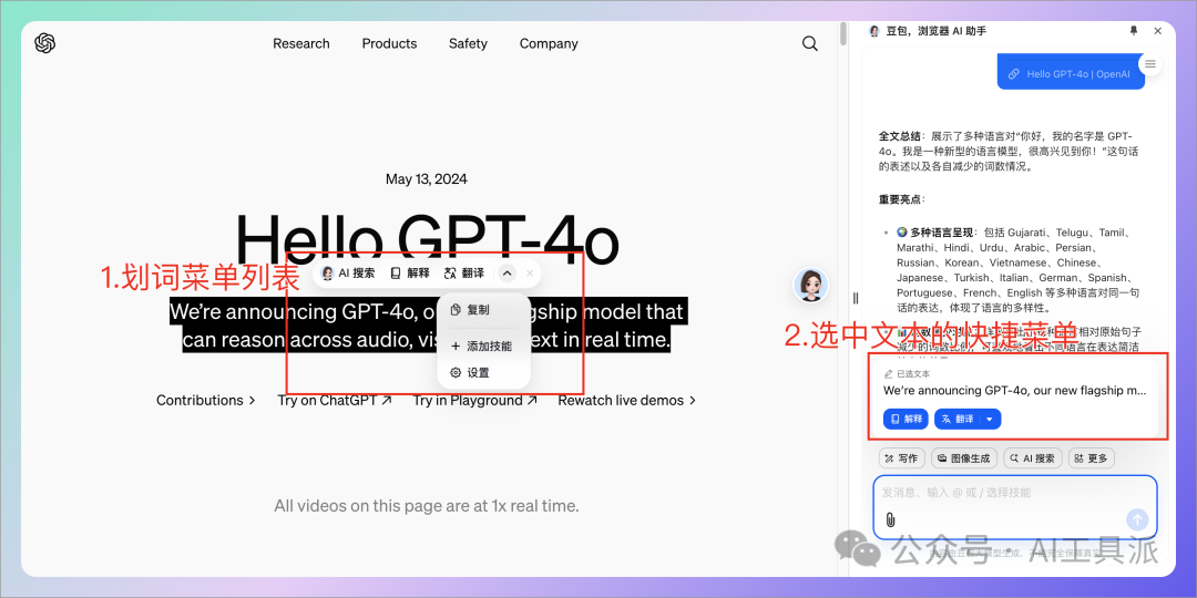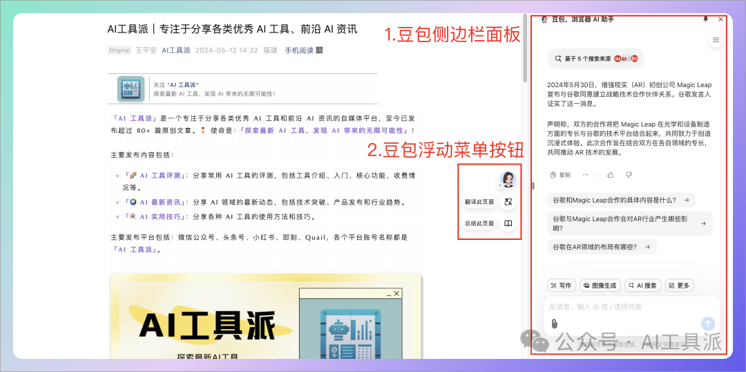 之前很受欢迎的 Elmo 和 Kimi 浏览器插件,让我们意识到 AI 可以如此高效地提升我们的工作和学习效率。现在,豆包推出全新的豆包浏览器插件,也带来显著的效率提升。支持包括 Chrome、Edge、Safari 等主流浏览器等。插件的核心功能包括: