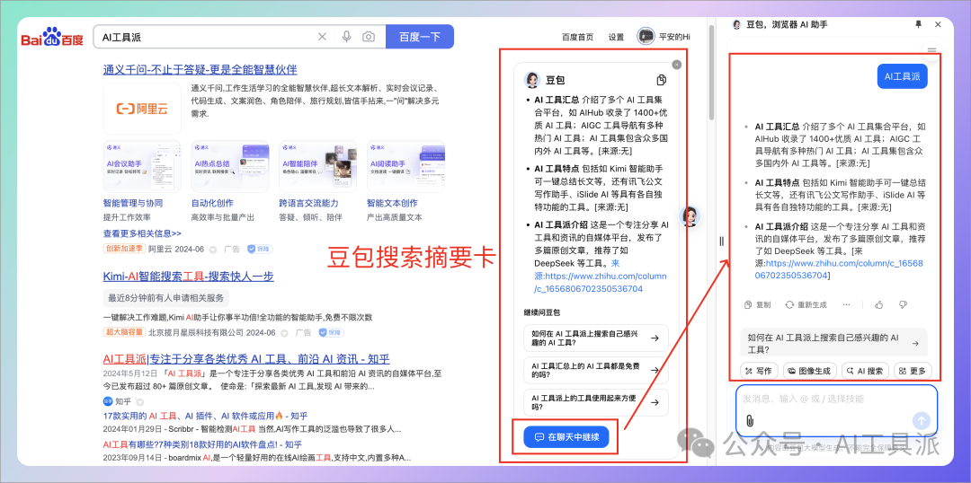 豆包插件可以在搜索页面中,展示搜索摘要卡,不仅可以快速搜索总结,还可以向豆包继续提问,在聊天中继续对话,改变了以往的搜索体验。