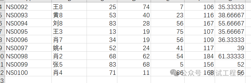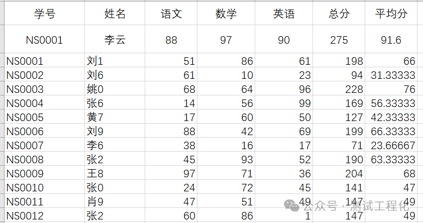 # 随机生成学生数据for i in range(1, 101):# 从1到100生成100个学生信息# 学号student_id = f"NS{str(i).zfill(4)}"# 姓名surname = random.choice(surnames)name = f"{surname}{random.randint(0, 9)}"# 语文、数学、英语成绩scores = [random.randint(1, 100) for _ in range(3)]total_score = sum(scores)average_score = total_score / len(scores)
