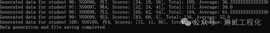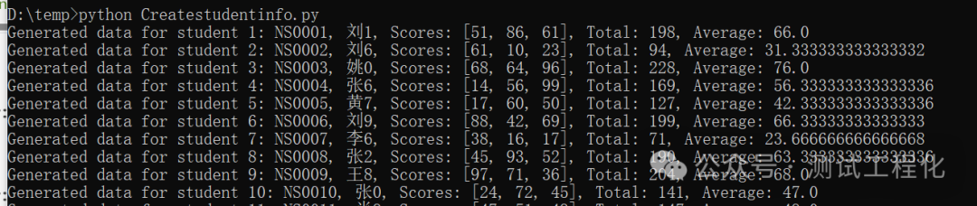 # 输出执行信息print(f"Generated data for student {i}: {student_id}, {name}, Scores: {scores}, Total: {total_score}, Average: {average_score}")