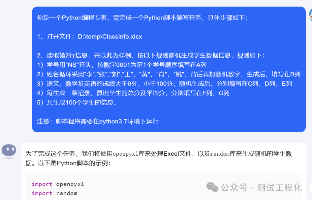 第2步:提示词设置 提示词设计如下: ## 你是一个Python编程专家,需完成一个Python脚本编写任务,具体步骤如下:1、打开文件:D:\temp\Classinfo.xlsx2、读取第2行信息,并以此为样例,按以下规则随机生成学生数据信息,规则如下:1)学号用"NS"开头,按数字0001为第1个学号顺序填写在A列2)姓名循环采用“李”,"张","刘”,"王","黄",“肖","姚",背后再加随机数字,生成后,填写在B列3)语文、数学及英语的成绩大于0分,小于100分,随机生成后,分别填写在C列,D列,E列4)每生成一条记录,算出学生的总分及平均分,分别填写在F列,G列我们需要注意,python程序运行的环境,因为不同版本的python存在兼容性问题,而AI 写的脚本程序并不一定在你的环境下可正确运行。所以,在提示词设计时,要明确出来(此处,我踩坑了,是后面才加上去的) 第3步:AI生成脚本程序 2、把上面提示词内容复制到Kimi 对话框中,如下:
