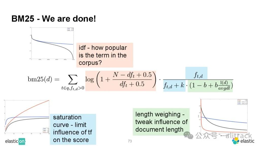 其中,(N)是文档集合中的文档总数,(n(qi))是包含查询词(qi)的文档数量。IDF值越高,表示查询词在文档集合中越稀有,其权重越大。 2.词频和文档长度的标准化:BM25考虑到词频(TF)与相关性之间的关系是非线性的。为了平衡词频对得分的影响,引入了饱和函数和文档长度因子。标准化后的词频公式为: