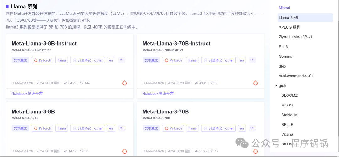 一般来说我们可以在modelscope中搜索最新的大模型,以Llama系列为例子。其中