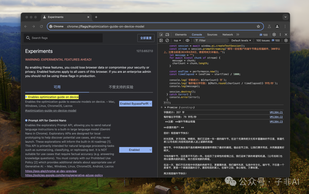 如果一切顺利,你将看到控制台输出一个笑话,这意味着你已经成功调用了 Chrome 内置的 Gemini Nano 模型! 案例演示:使用 Chrome 内置 Gemini Nano 撰写端午节商业祝福邮件为了更直观地展现 Chrome 内置 Gemini Nano 模型的能力,让我们来尝试一个实际应用场景:撰写一封给客户的端午节商业祝福邮件。 代码实现:(async()=>{ try{ if(!window.ai||(awaitwindow.ai.canCreateTextSession())!=="readily"){ thrownewError("GeminiNanonotreadyornotsupported."); }