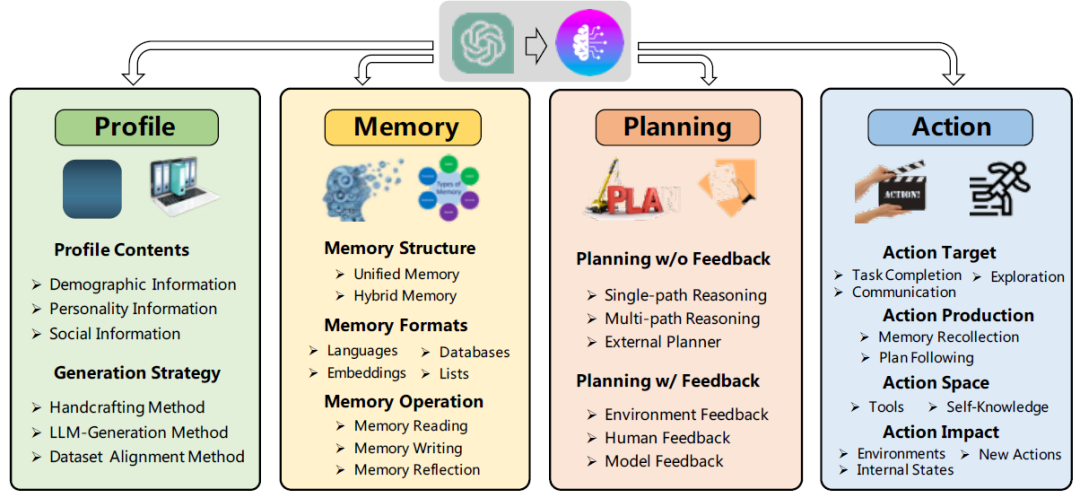 图2 基于LLM的Agent系统概览 9月份,人民大学高瓴推出《A Survey on Large Language Model based Autonomous Agents》[4]综述论文。在该论文中,Agent被定义为由四个部分组成:分析模块(Profile)、记忆模块(Memory)、规划模块(Planning)和行动模块(Action)。其中,动作模块包含了工具部分,并新增分析模块,如图3所示。