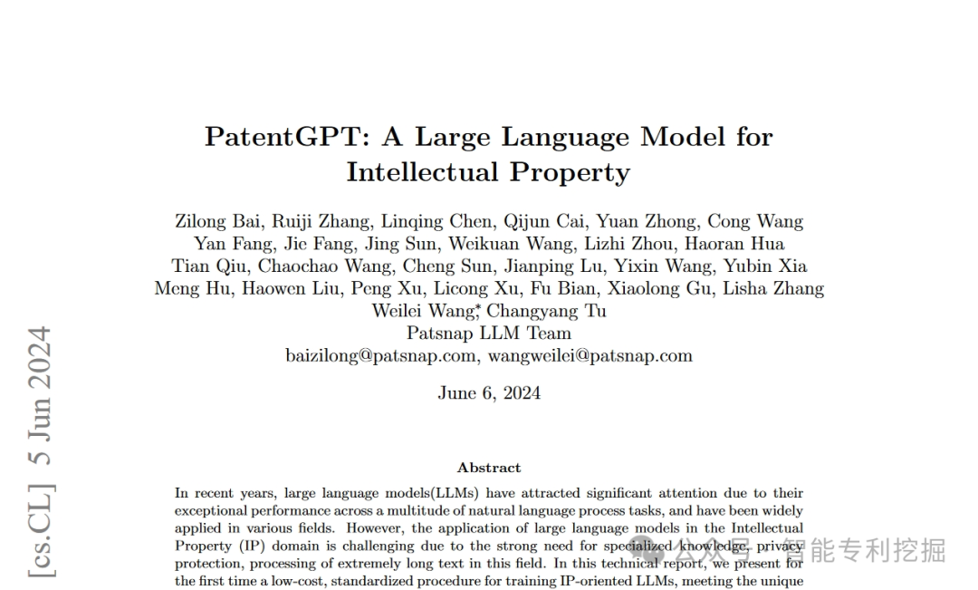 一直听说智慧芽在搞大模型,但搞成什么样子并不清楚。最近查文献时候,无意中看到一篇文章《PatentGPT: A Large Language Model for Intellectual Property》,细看正是智慧芽今年5月8号发布的大模型技术报告,赶紧读了一下。