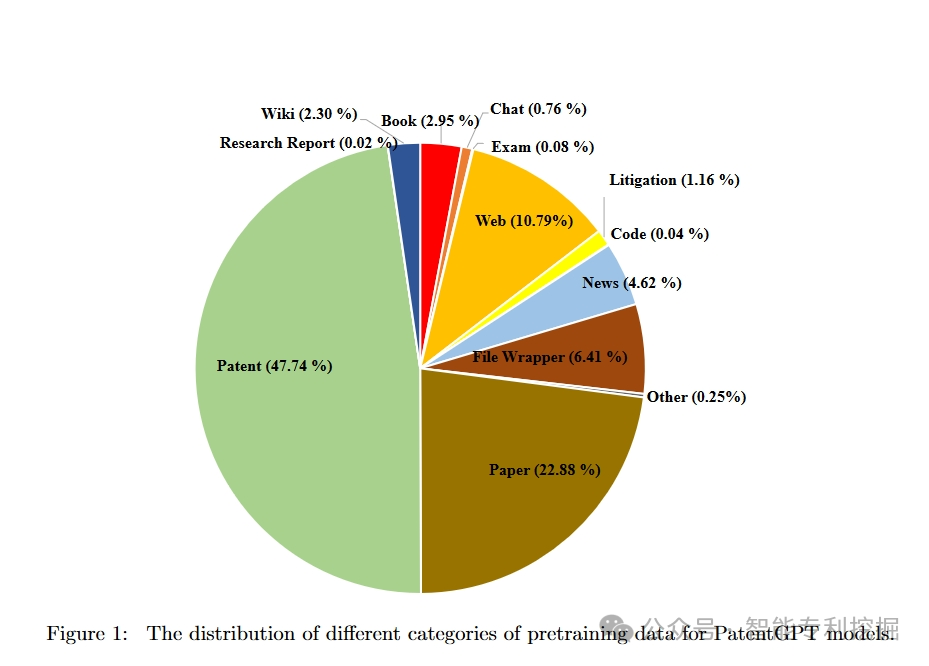 (2)智慧芽准备了包含2400亿token的“面向知识产权的数据”作为训练数据集,这个“面向知识产权的数据”也不完全是专利数据,它包括公开数据如网页、百科、书籍、试题数据库、代码仓储、新闻、论文等,还有内部数据如专利、标注数据集、诉讼记录和File wrapper等,这个File wrapper的说法少见一点,据原文解释是从专利申请到授权流程中有关申请材料、审核、修改、复议等记录在专利受理局的书面文件。我个人认为File wrapper是整个训练数据集的精华,它记录了有可能破坏目标专利可专利性的其他文件以及其中的证据和依据,这块内容深挖下去的话,有可能实现专利审查、X文件识别等任务的部分自动化,这对当前专利信息服务来说无疑是一个巨大的进步。智慧芽公布了一个训练数据集的配比如下图。
