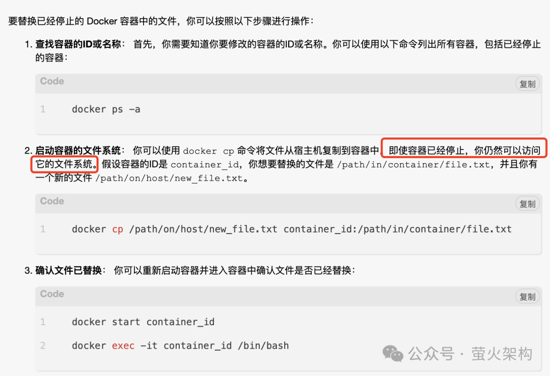 正好这两天我遇到了一个技术问题:有个Docker容器实例的文件被我搞坏了,导致实例无法启动,我想把这个搞坏的文件替换为原版本,但是我对这块不熟,不知道该怎么办?于是我想到了万能的大模型。