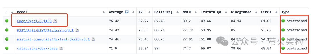 然后我又看了一下开源模型的榜单,比较能打的是 Qwen1.5-110B-Chat,在HuggingFace的千亿预训练模型的对比中排名第一,可以说在开源大模型中,通义千问确实很能打。不过 Qwen1.5-110B 发布的比较早,发布时间是两个月之前,也不是当前的通义千问2.5。
