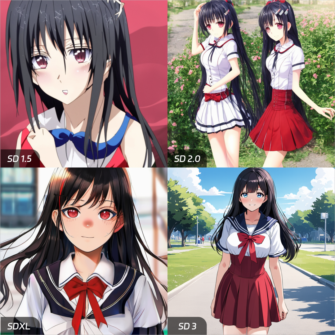 SD1.5:底模过于抽象。。。很多细节都丢失了,对比着看一下吧,从头发到眼睛。 SD1.5:千手观音? SDXL:有点感觉了,但是你的画风画质很难评 SD3:没的说,依然是王炸!从头发到眼镜,从整体画质,到细节,No1! 动漫还做了另一组对比图。